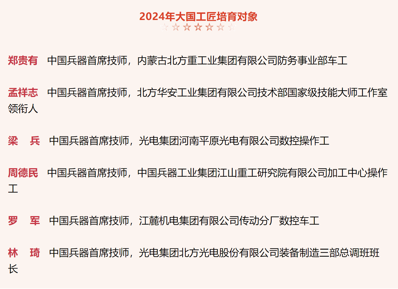 兵器工業(yè)集團(tuán)6名高技能人才入選2024年大國工匠培育對象名單